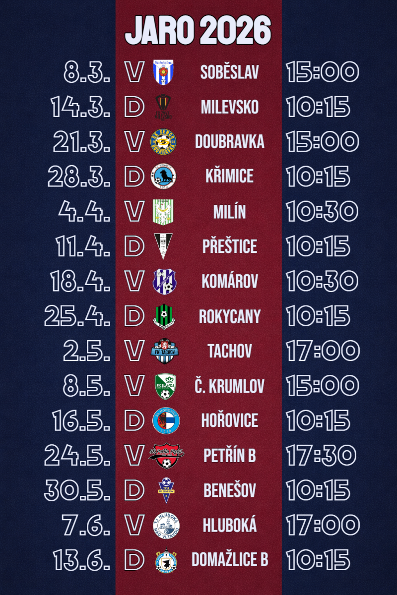 Fotbalové jaro pomalu klepe na dveře. Za necelé tři týdny (neděle 8. března) nastoupíme k prvnímu soutěžnímu zápasu. Oproti původním plánům ale nezamíříme přímo do Soběslavi, zápas proti jihočeskému soupeři se odehraje na umělce v Třeboni, ta je zhruba 35 kilometrů od Soběslavi.