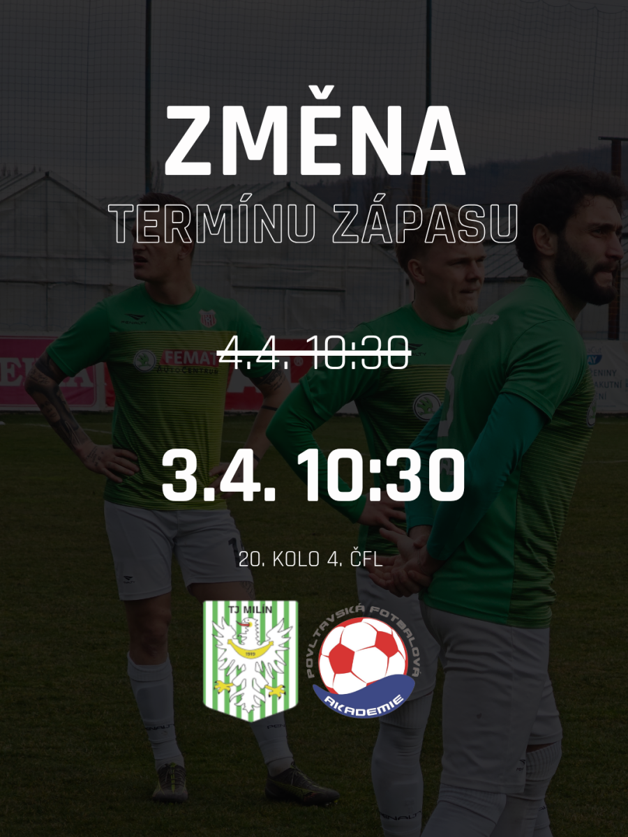 Mezi velikonočními svátky má mužstvo na programu zápas na hřišti Milína. Po dohodě klubů došlo ke změně termínu utkání – původní sobotní termín (4. 4. od 10:30) se ruší a nahrazuje jej pátek 3. 4., se stejným dopoledním časem výkopu v 10:30.