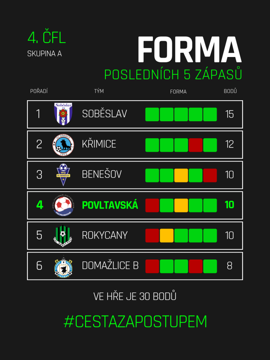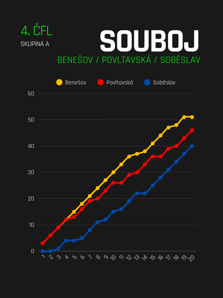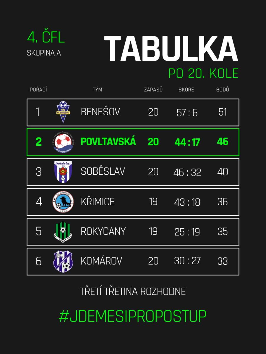 Boje ve čtvrté lize vstupují do závěrečné třetiny. Do konce sezony zbývá deset zápasů. Vývoj v tabulce se otočil – Benešov začal oproti podzimu více ztrácet a náskok se postupně snížil na pět bodů. V součtu se vzájemným zápasem, který nás čeká ve druhé polovině května, zůstává vše otevřené. Jak si vedeme řečí čísel?