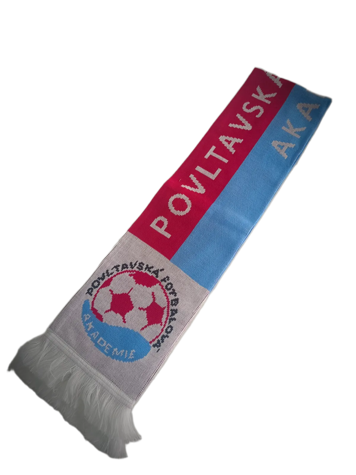Pletená šála s nápisem Povltavská fotbalová akademie a logem z obou stran.