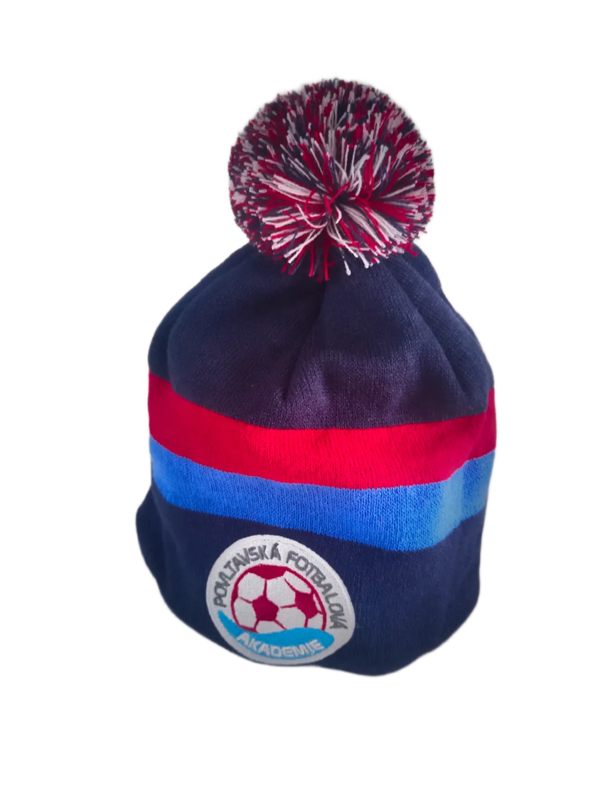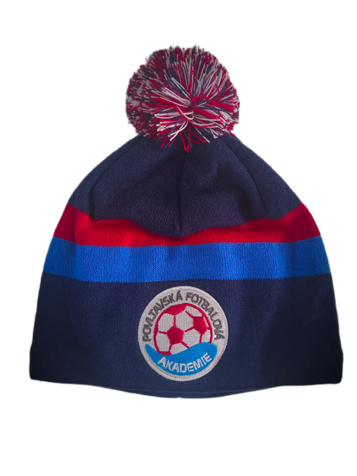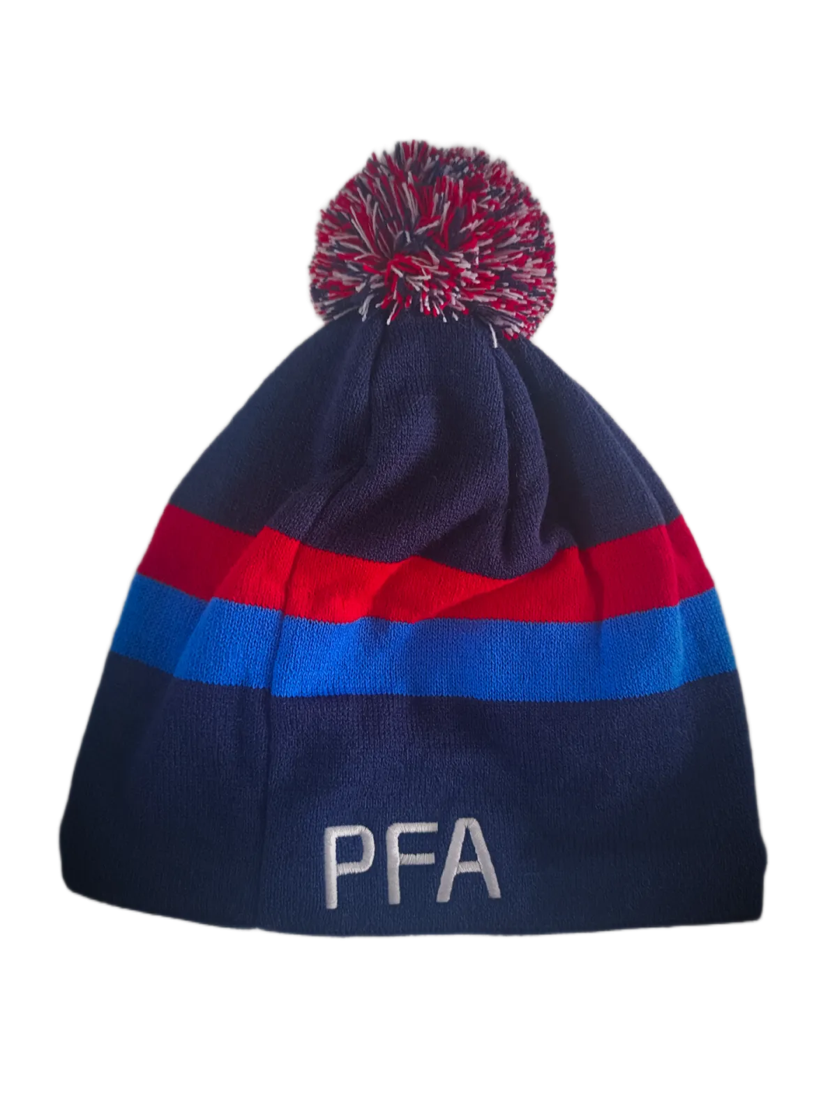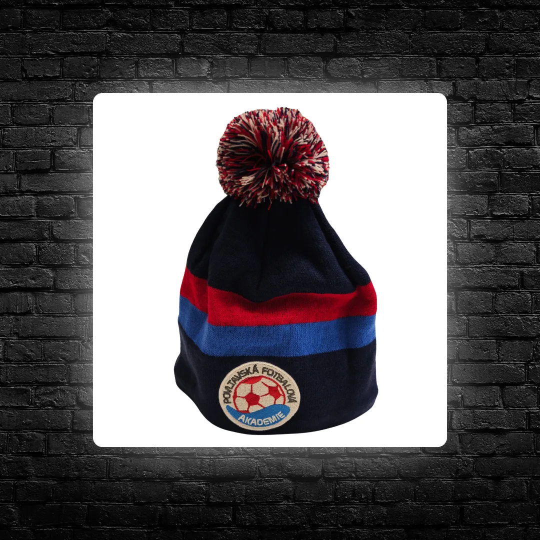 Tmavě modrý kulich se světle modrým a červeným pruhem. Zepředu vyšité logo PFA a zezadu nápis PFA.